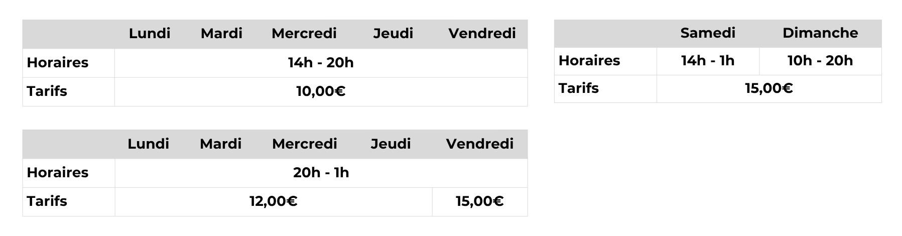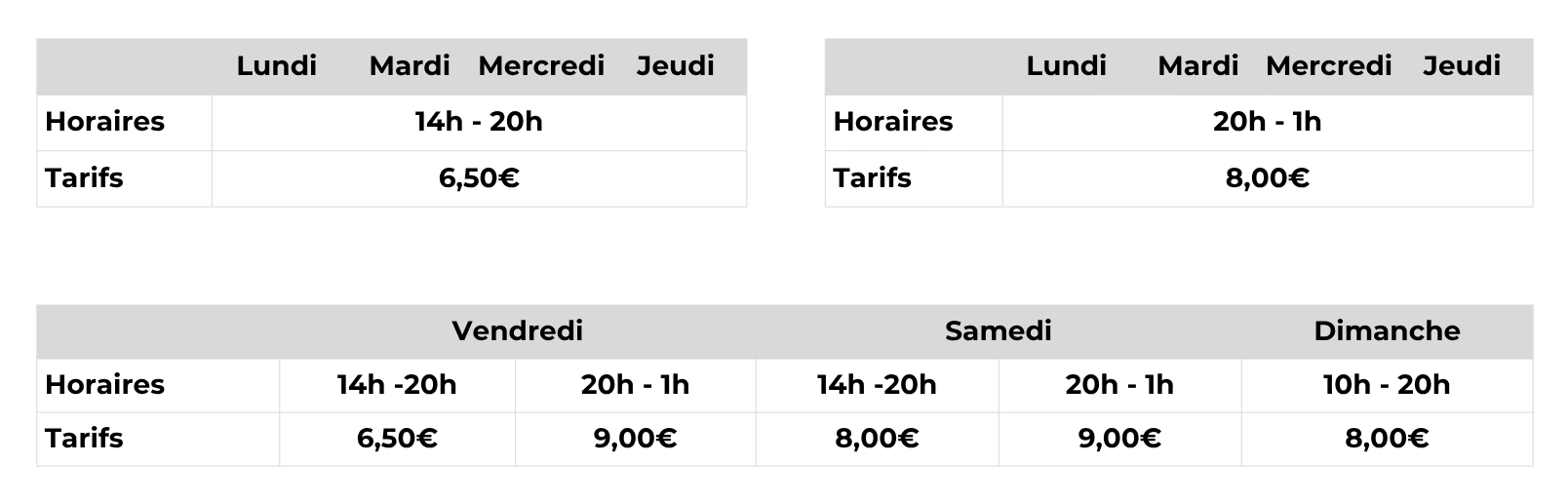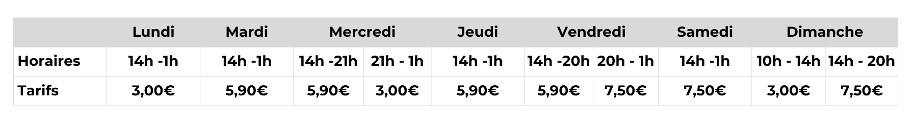 Le bowling est ouvert tous les jours de la semaine et même le soir au-delà de minuit. Vous pourrez donc venir passer vos soirées à enchaîner les strikes entre deux cocktails.